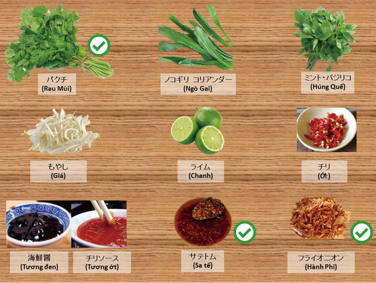 ここで、タムタムから教わったフォーのトッピング表をもう一度見てみましょう。