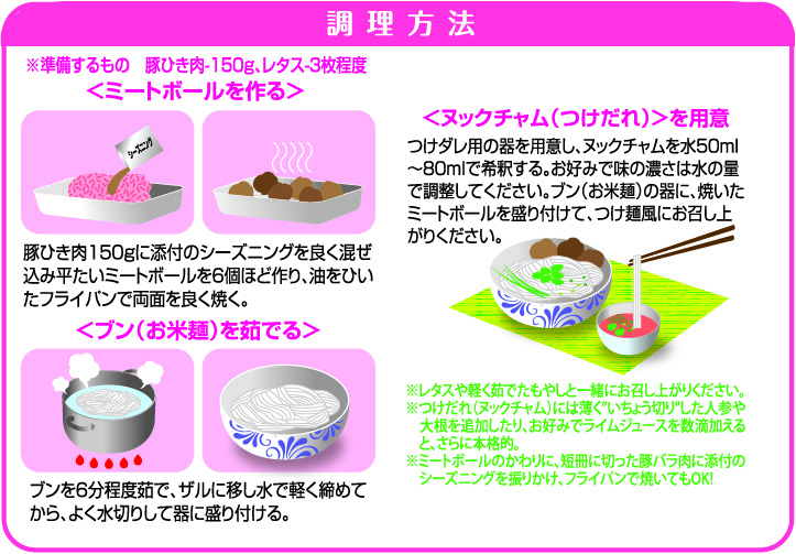 米めん(米(ベトナム産))、つけだれ(魚醤(魚介類)、砂糖、にんじん、大根、にんにく、唐辛子、食塩 / pH調整剤、酸化防止剤(V.C)、リン酸Na、酸味料、増粘多糖類、微粒二酸化ケイ素、(一部に魚醤(魚介類)を含む))、下味パウダー(砂糖、エシャロットパウダー、魚醤パウダー(魚介類)、食塩、ガーリックパウダー、オニオンパウダー、こしょう末、植物油脂、オイスターパウダー / 調味料(アミノ酸)、微粒二酸化ケイ素、くん液、カラメル色素、(一部に魚醤パウダー(魚介類)を含む))