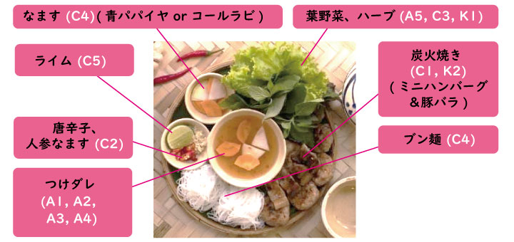 | C4 | 白 | Trắng (チャン) | ブン麺 (Bún), (青パパイヤまたはコールラビ) Đu đủ xanh hoặc Su hào |