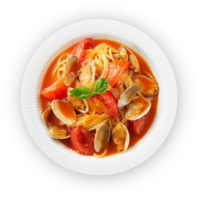 - 鍋を熱し、オリーブ油を入れ、千切りした玉ねぎ、あさり、ざく切りしたトマトを加え、あさりの殻が開き始めるまで炒める。