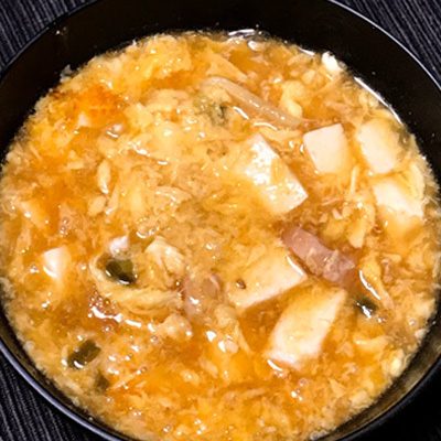 煮立った状態で溶き卵を上からゆっくりいれ、すぐ火を止め完成。