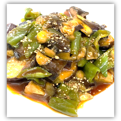 なすとピーマンをごま油で炒め、途中で砂糖を入れます。