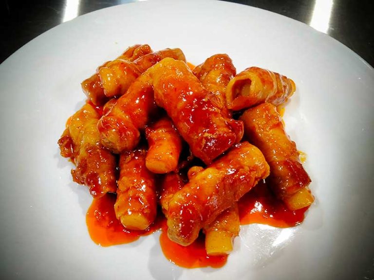 豚バラ肉でトッポギを巻いて甘辛ダレで煮込みます。 少し手が込んでいますが、トッポギソースと豚バラ肉のコクがばっちりマッチします。お酒が進むメニューです。