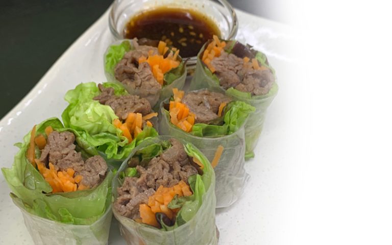 - ライスペーパーの手前にサニーレタス、炒めた人参と牛肉を乗せひと巻きする。